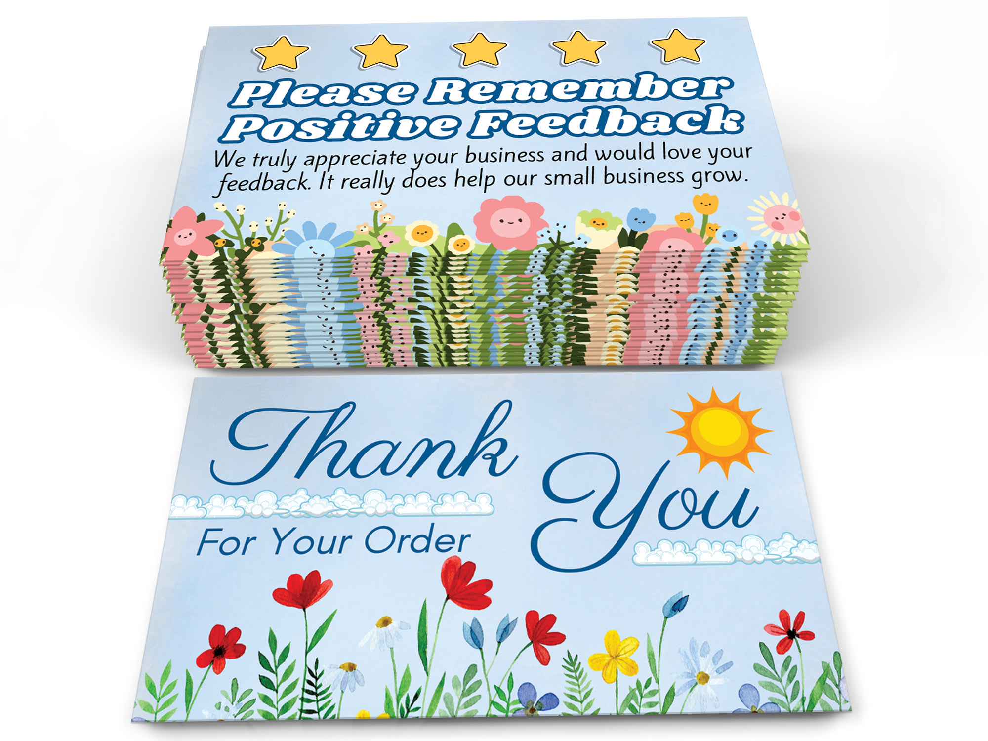 Our Blue Sky Seller Thank You Cards feature a vibrant blue sky and floral theme that creates a heartfelt “thank you” impression while encouraging buyers to leave positive feedback. Perfect for eBay, Etsy, Shopify, Poshmark, Mercari and more, these card inserts help elevate your brand, enhance buyer experience, and grow your online store reputation